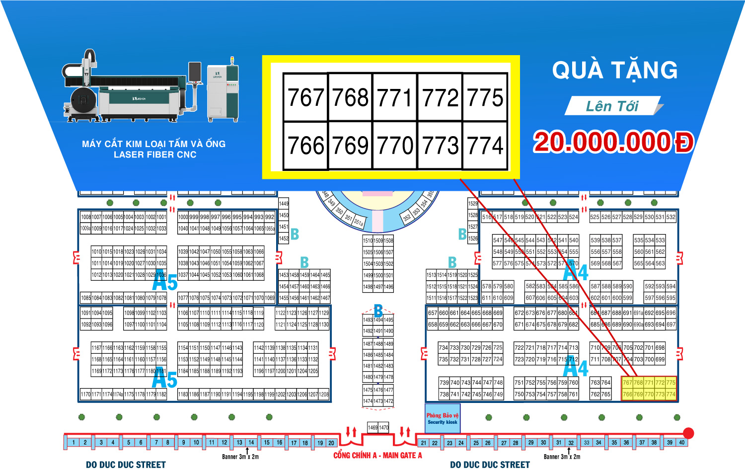 Quy mô: gồm 10 gian hàng tại nhà trung tâm A4( từ gian 766 – 775)